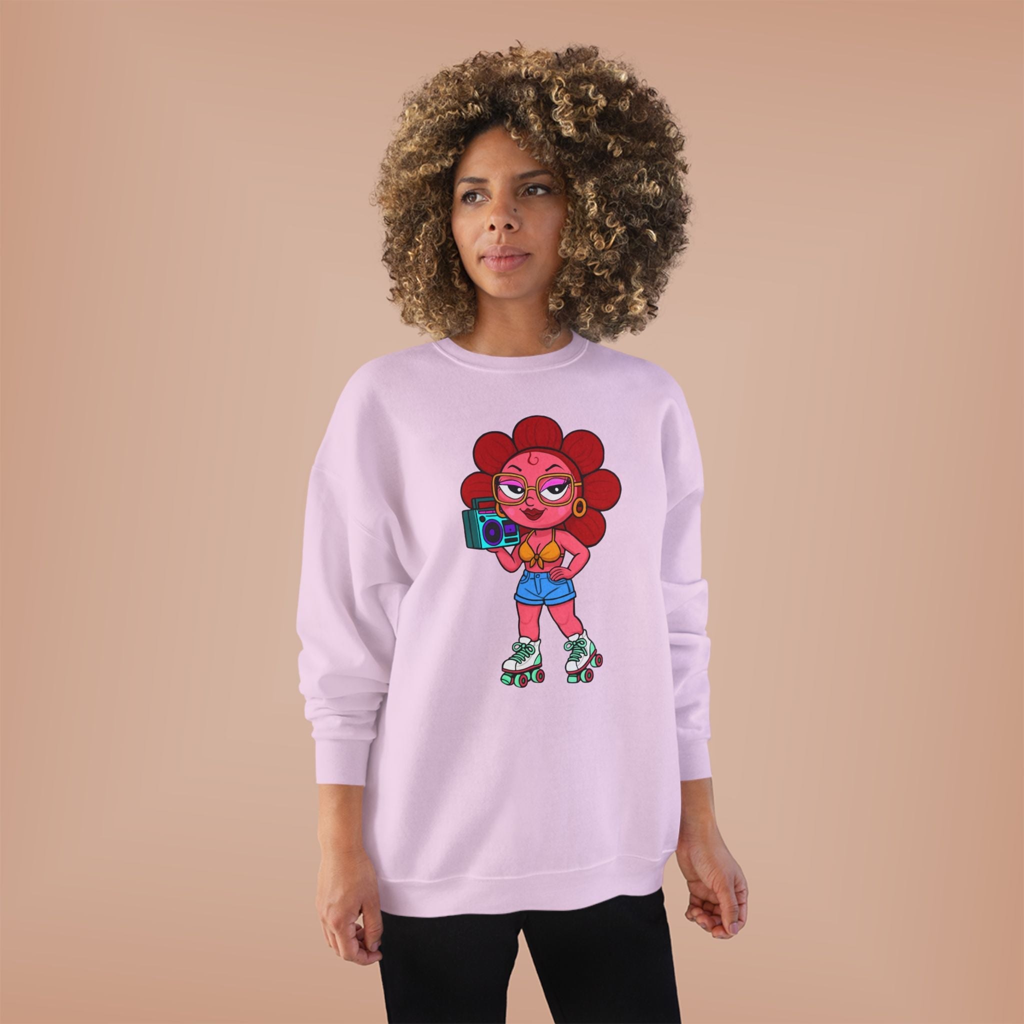 This sweatshirt features Venice Sweet Pea, part of the LA Sweet Pea drop, carrying her boombox and skating confidently through her own lane. She’s calm, expressive, and unapologetically herself. Just like you.