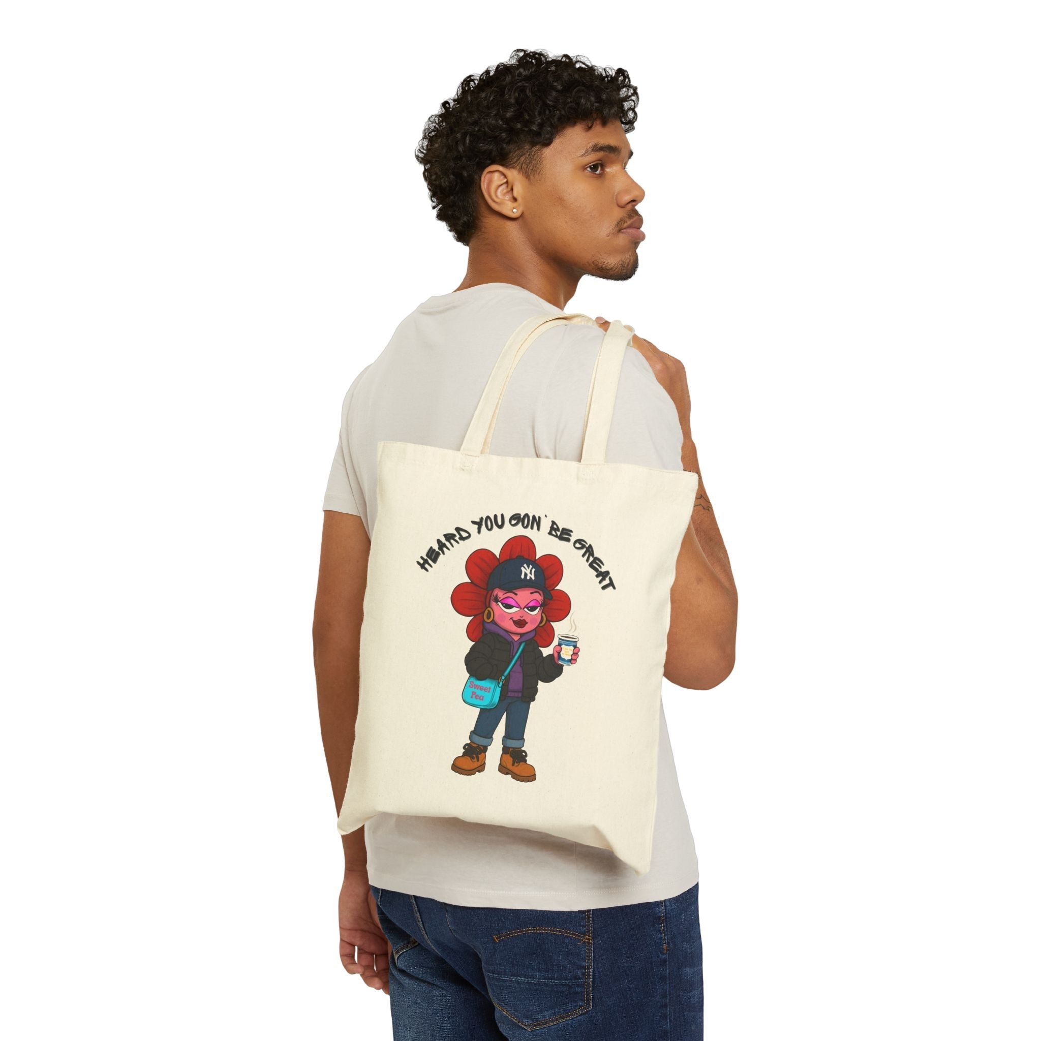 Pea-Lo’s gentle but bold style stands out without clashing. Her outfit mixes neutrals and soft colors. The warm cup adds personality and comfort. The artwork balances sweetness and street charm. This makes the tote easy to pair with many looks. You can match it with puffer jackets, jeans, sweats, or cozy layers. The design always keeps its charm. It feels like a wearable mood you can take anywhere.